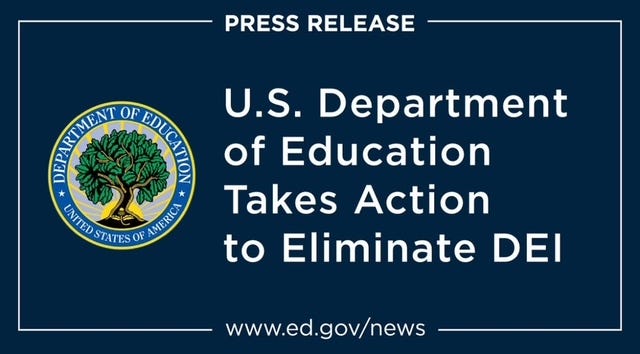 The U.S. Department of Education has taken action to eliminate harmful DEI initiatives... These actions are in line with President Trump’s ongoing commitment to end illegal discrimination and wasteful spending across the federal government. They are the first step in reorienting the agency toward prioritizing meaningful learning ahead of divisive ideology in our schools.
