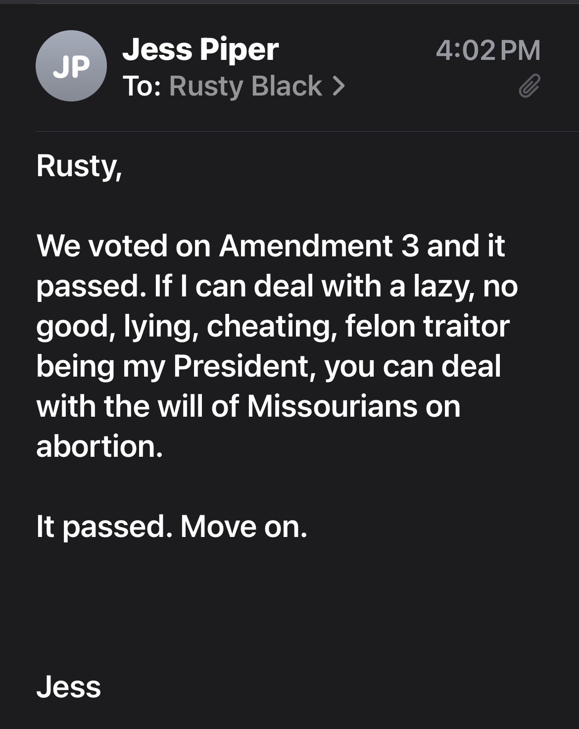 Yesterday, my State Senator sent his monthly newsletter expressing his opposition to the abortion amendment Missourians just passed. He said he would actively fight to overturn the will of Missouri voters. I spent about two minutes sending an email in response: